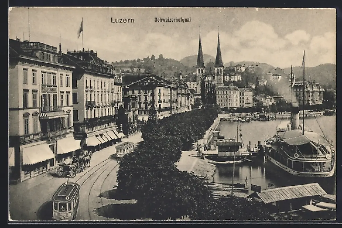 AK Luzern, Schweizerhofquai mit Strassenbahn