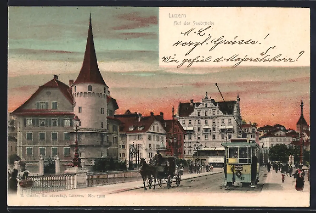 AK Luzern, Seebrücke mit Strassenbahn und Pferdekutsche