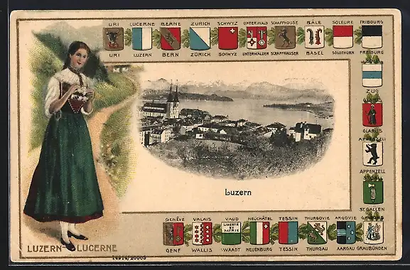 AK Luzern, Teilansicht mit Kirche, Frau in Tracht, Wappen von Tessin, Wallis und Genf, Passepartout