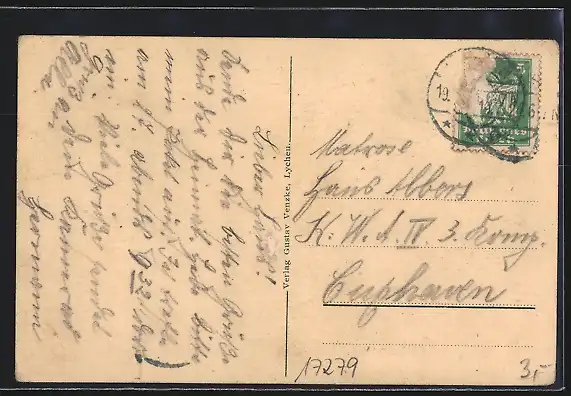 Personenbezogene Daten auf der Rückseite der Karte wurden durch blauen Textmarker unkenntlich gemacht. Die blauen Stellen sind auf die Vorderseite durchgeweicht und wirken sich negativ auf das Postkartenfoto aus