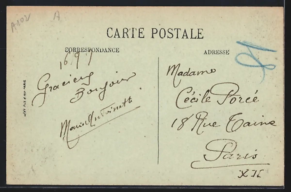 Personenbezogene Daten auf der Rückseite der Karte wurden durch blauen Textmarker unkenntlich gemacht. Die blauen Stellen sind auf die Vorderseite durchgeweicht und wirken sich negativ auf das Postkartenfoto aus