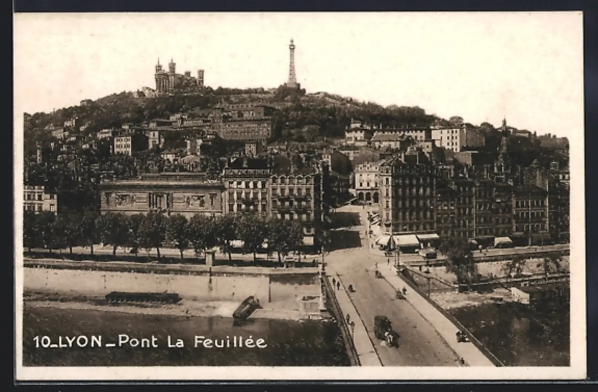 AK Lyon, Pont La Feuillée et vue sur la colline de Fourvière