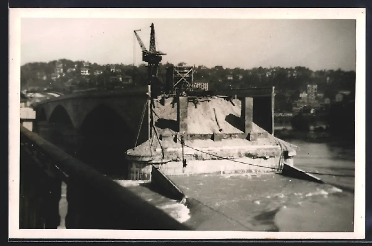 AK Lyon, Pont Poincaré en construction avec vue sur la rivière et les collines en arrière-plan