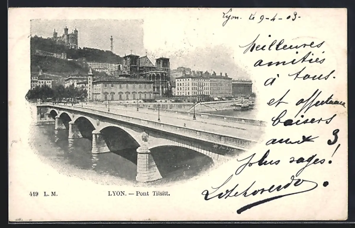 AK Lyon, Pont Tilsitt et vue sur la colline de Fourvière