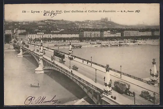 AK Lyon, Pont du Midi, Quai Gailleton et Colline de Fourvière, Strassenbahn