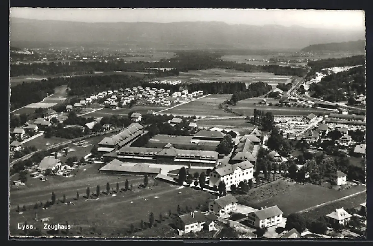 AK Lyss, Zeughaus mit Umgebung, Fliegeraufnahme