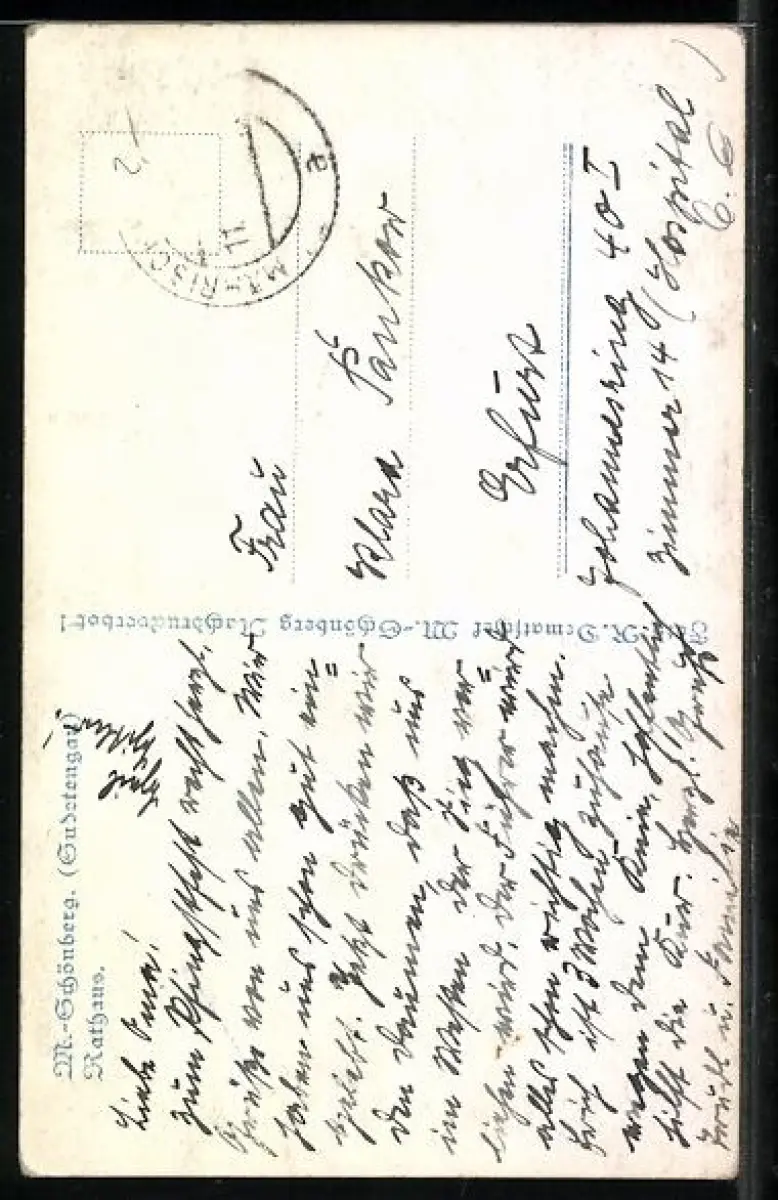 Personenbezogene Daten auf der Rückseite der Karte wurden durch blauen Textmarker unkenntlich gemacht. Die blauen Stellen sind auf die Vorderseite durchgeweicht und wirken sich negativ auf das Postkartenfoto aus