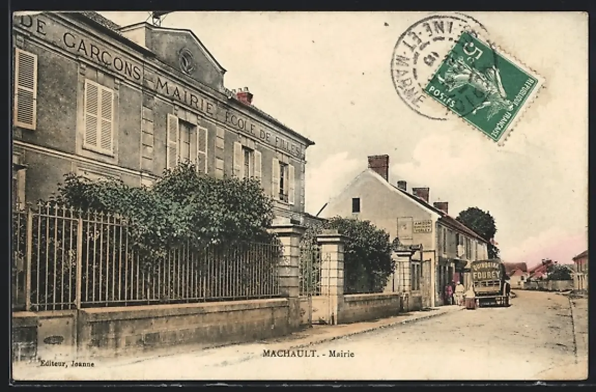 AK Machault, Mairie et rue principale avec un bus devant l`école
