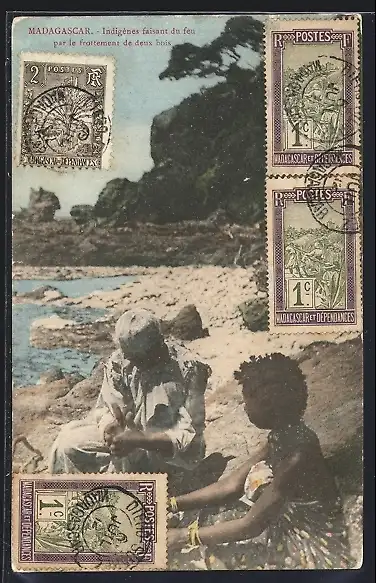 AK Madagascar, Indigènes faisant du feu par le fottement de deux bois