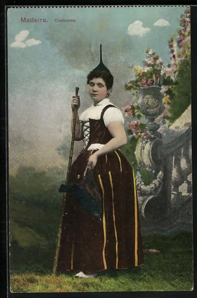 AK Madeira, Portugiesische Frau in Tracht mit Stock