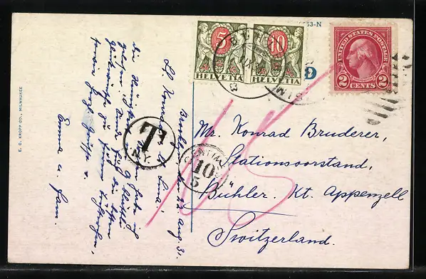 Personenbezogene Daten auf der Rückseite der Karte wurden durch blauen Textmarker unkenntlich gemacht. Die blauen Stellen sind auf die Vorderseite durchgeweicht und wirken sich negativ auf das Postkartenfoto aus