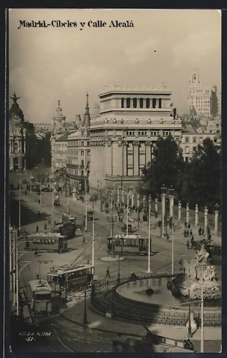 AK Madrid, Cibeles y Calle Alealá, Strassenbahn