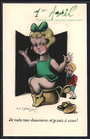 AK Mädchen auf dem Nachttopf, der Bruder wartet ungeduldig