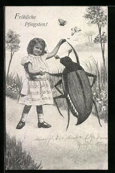 AK Mädchen beim Tanz mit einem Maikäfer, Pfingstgruss