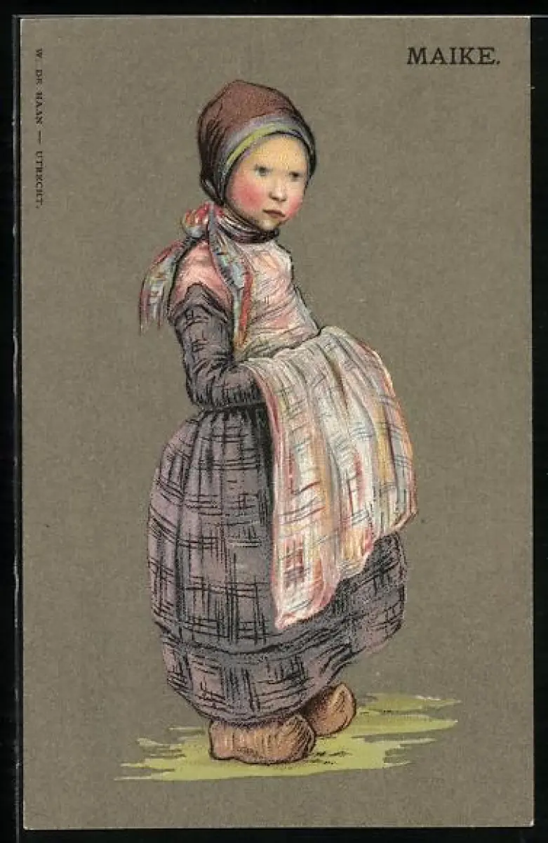 AK Mädchen im Kleid mit Schürze und Holzschuhen