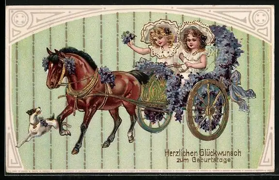 AK Mädchen in Pferdekutsche mit Vergissmeinnicht, Geburtstag