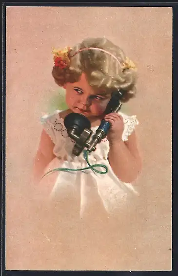 AK Mädchen in einem weissen Kleidchen am Telefon