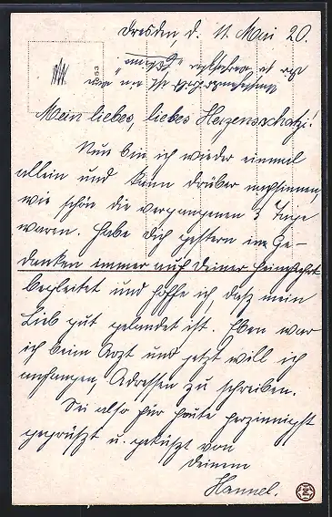 Personenbezogene Daten auf der Rückseite der Karte wurden durch blauen Textmarker unkenntlich gemacht. Die blauen Stellen sind auf die Vorderseite durchgeweicht und wirken sich negativ auf das Postkartenfoto aus