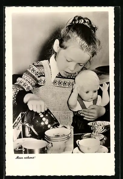 AK Mädchen mit Puppe beim backen