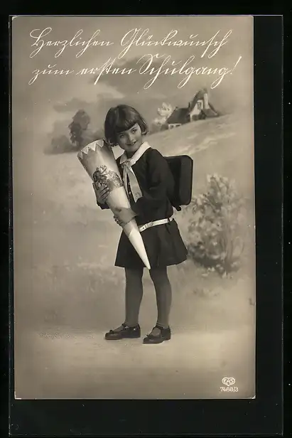 AK Mädchen mit Schultüte auf dem Weg zum ersten Schultag