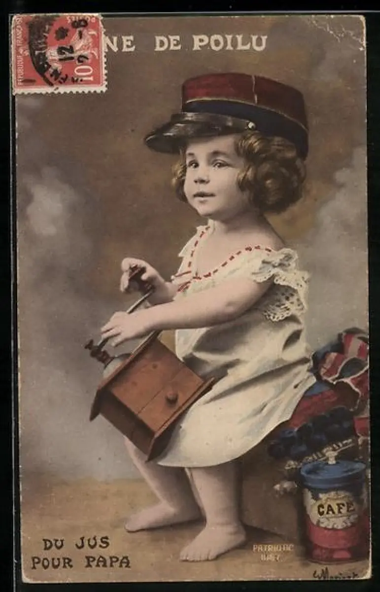 AK Mädchen mit Soldatenmütze dreht an der Kaffeemühle, Graine de Poilu, Du Jus Pour Papa