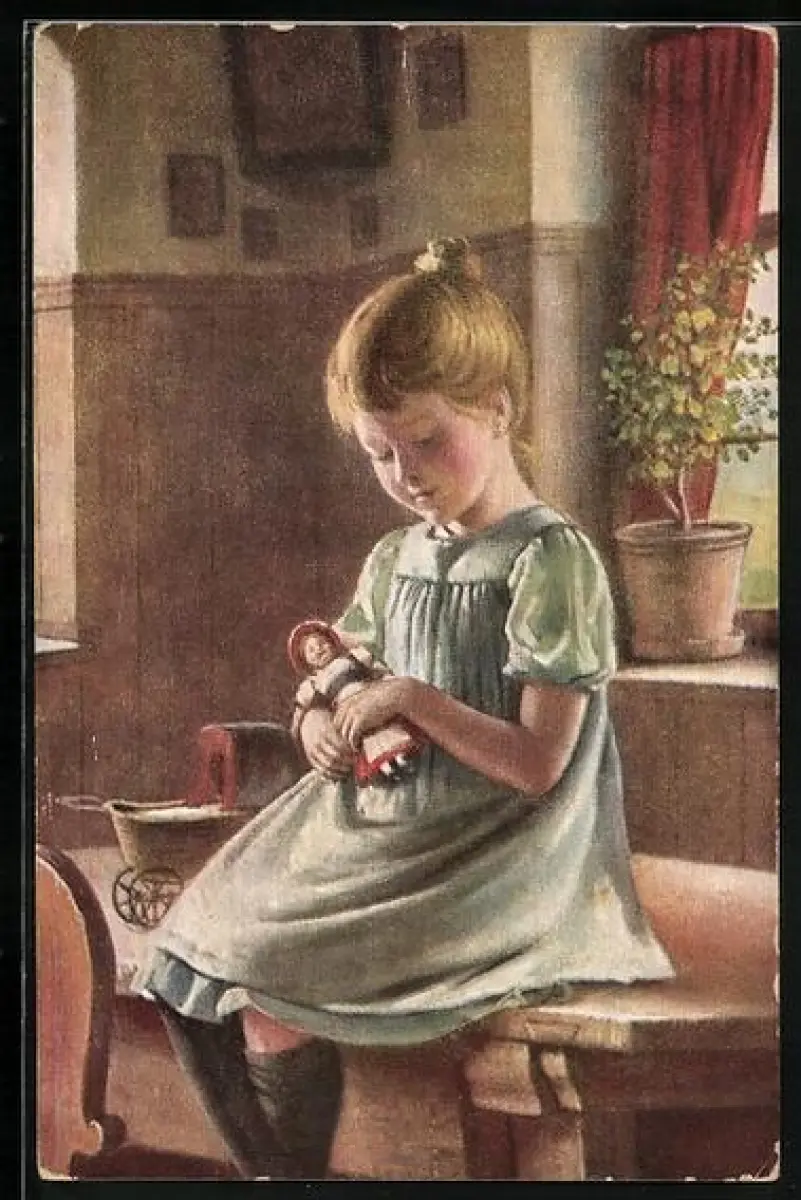 AK Mädchen mit ihrer Puppe im Arm