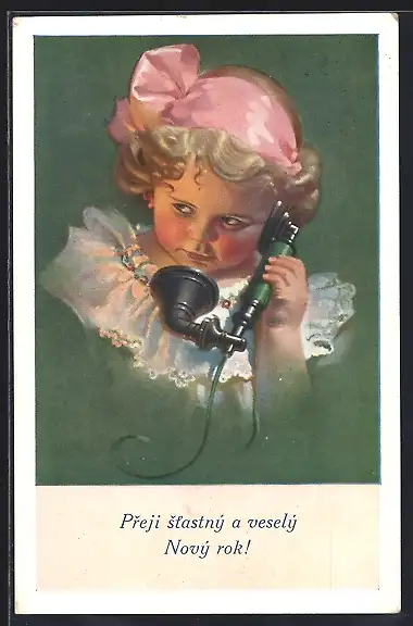 AK Mädchen mit rosafarbener Haarschleife am Telefon