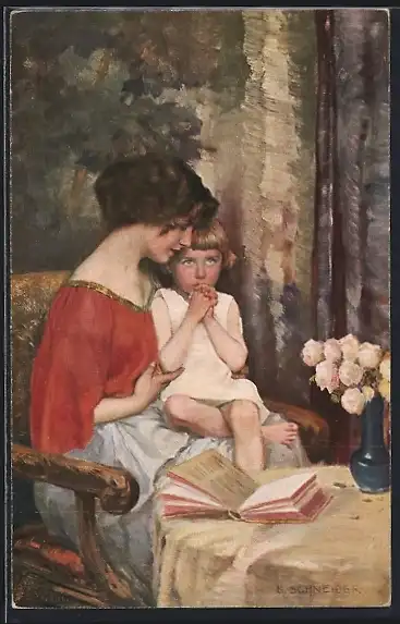 AK Mädchen sitzt auf Schoss der Mutter, Blumenstrauss