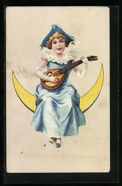 AK Mädchen spielt auf Halbmond sitzend eine Laute