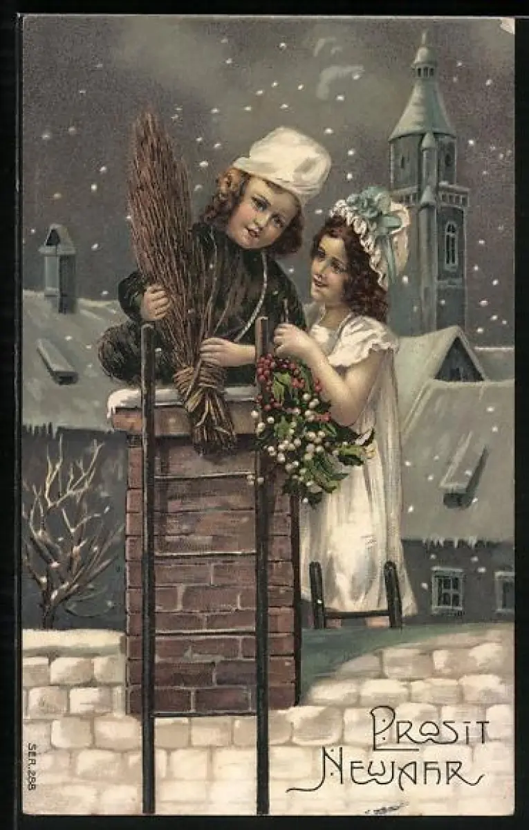 AK Mädchen steigt zu dem Schornsteinfeger aufs Dach, Prosit Neujahr