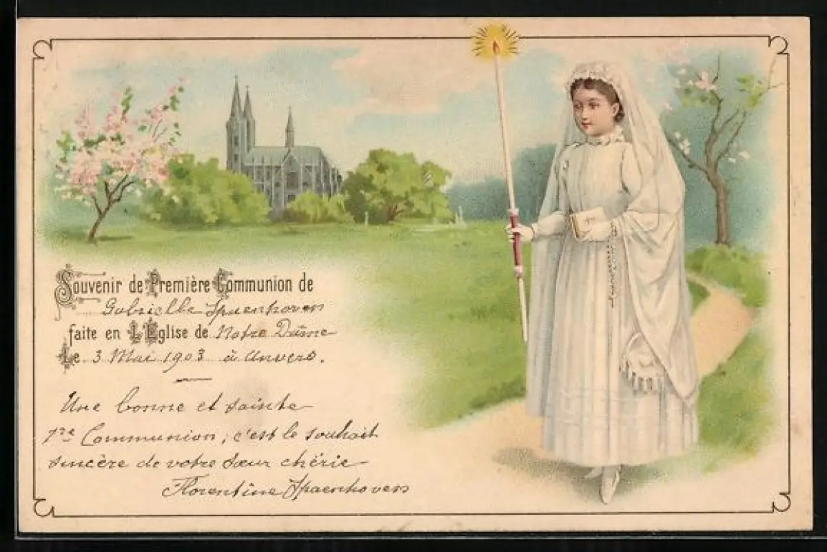 AK Mädchen zu ihrer ersten Kommunion mit Rosenkranz und Kerze