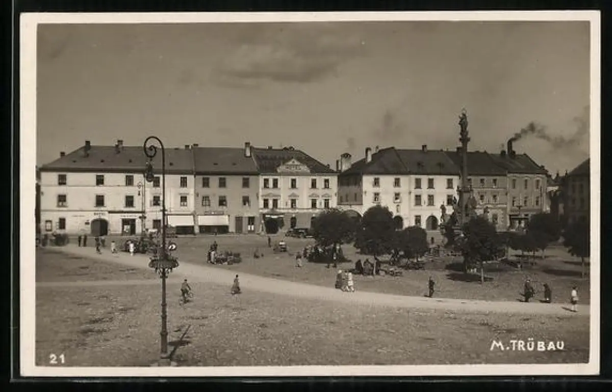 AK Mähr. Trübau, Stadtplatz mit Säulendenkmal u. Hotel, Marktbetrieb