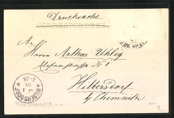 gelaufen 1904, Briefmarke entfernt, rückseitig Oberflächenschaden, Bugspuren oben li., sonst guter Zustand