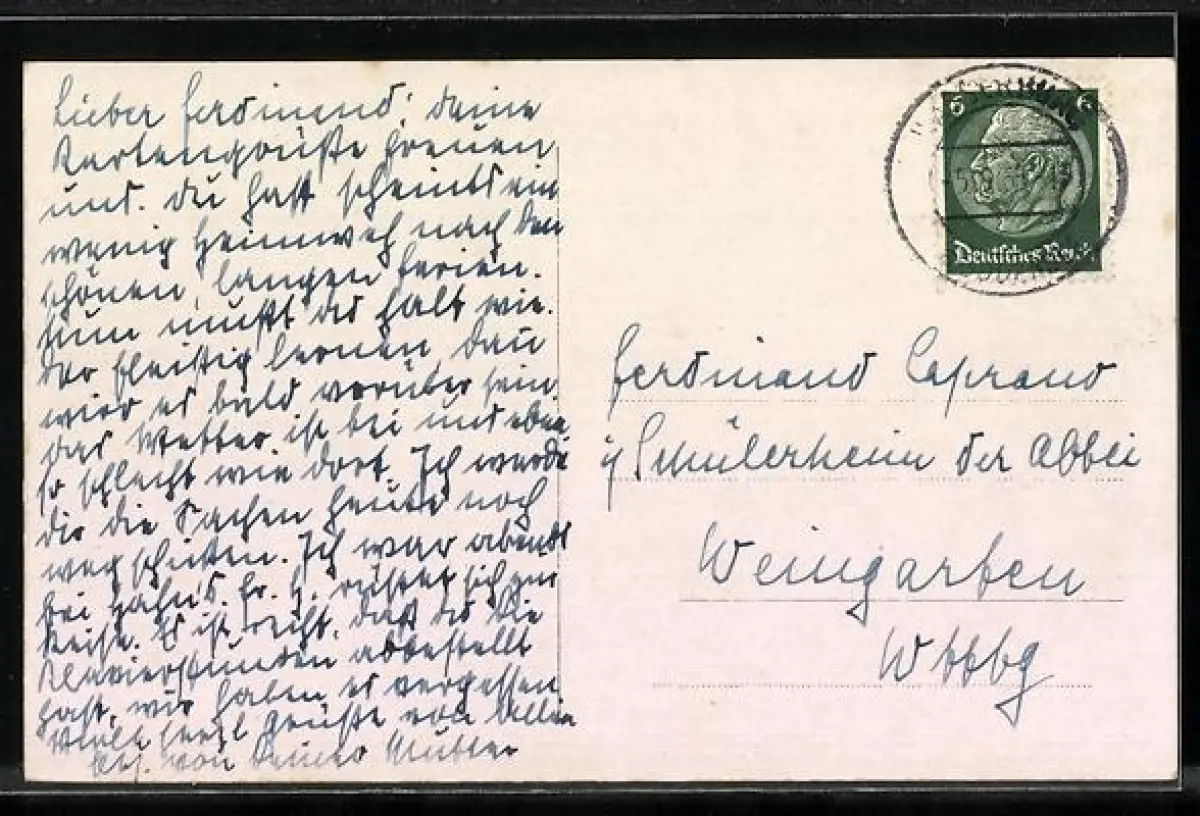 Personenbezogene Daten auf der Rückseite der Karte wurden durch blauen Textmarker unkenntlich gemacht. Die blauen Stellen sind auf die Vorderseite durchgeweicht und wirken sich negativ auf das Postkartenfoto aus