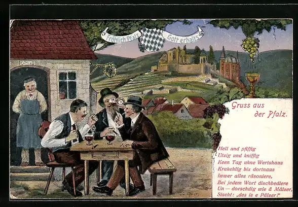 AK Männer trinken Wein an einer Gaststätte in der Pfalz