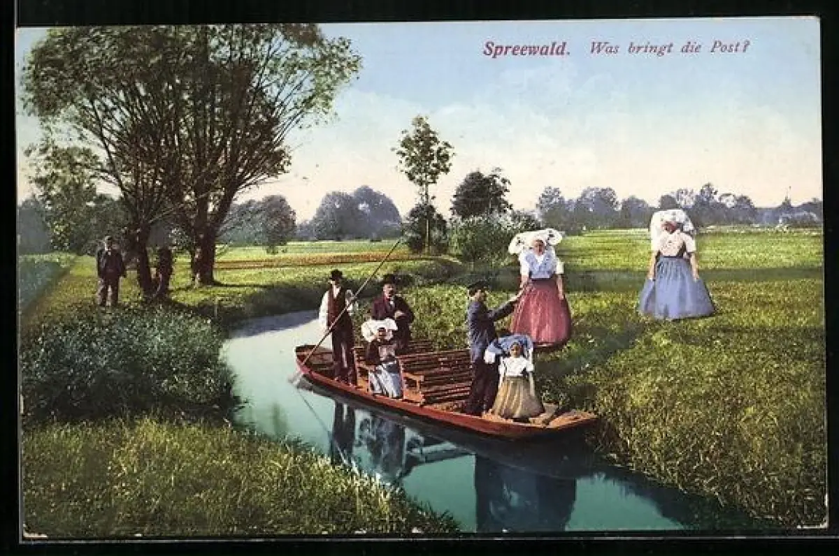 AK Männer und Frauen in spreewälder Tracht auf einem Boot bringen die Post