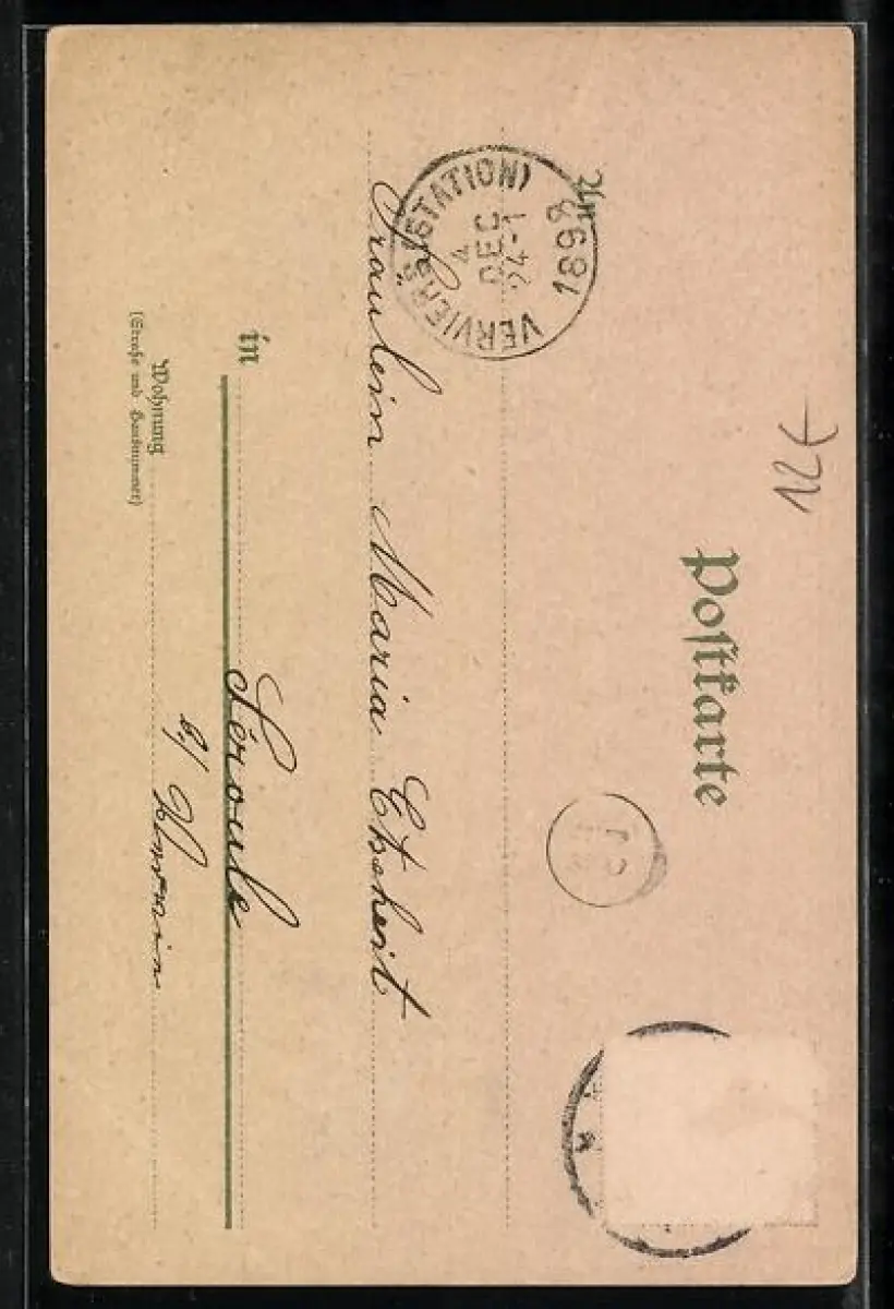 alte Ansichtskarte, gelaufen 1898, Briefmarke entfernt, rückseitig Oberflächenschaden, Eckknick re. unten, Bugspuren li. oben, minimaler Einriss re. oben