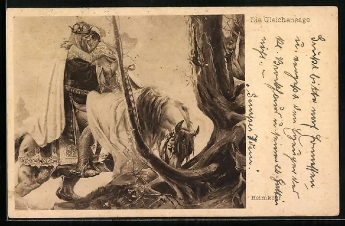 AK Märchen Die Gleichensage, Heimkehr, Ritter mit Dame zu Pferd