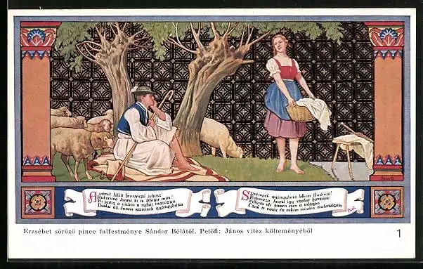 AK Märchen von Janos Vitez, Mann auf Schafsweide schaut Frau beim Waschen zu