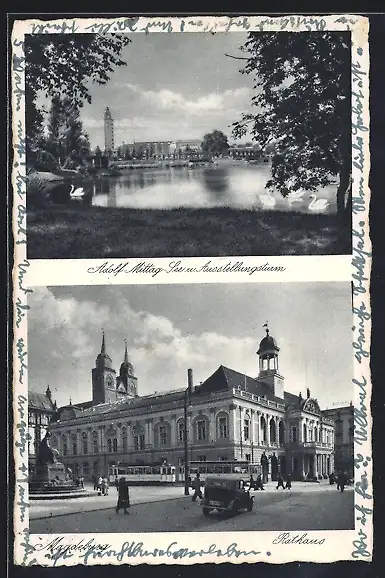 AK Magdeburg, Adolf-Mittag-See und Ausstellungsturm, Rathaus mit Strassenbahn