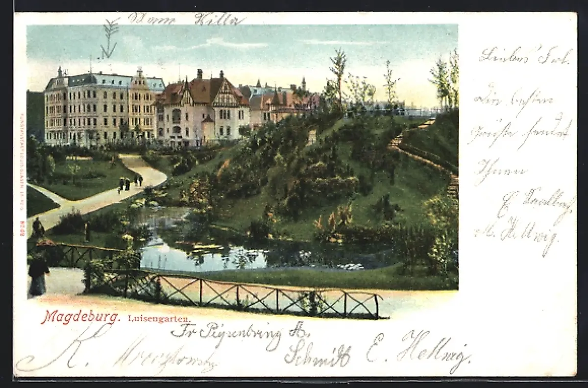 AK Magdeburg, Luisengarten mit Gebäuden u. Teich