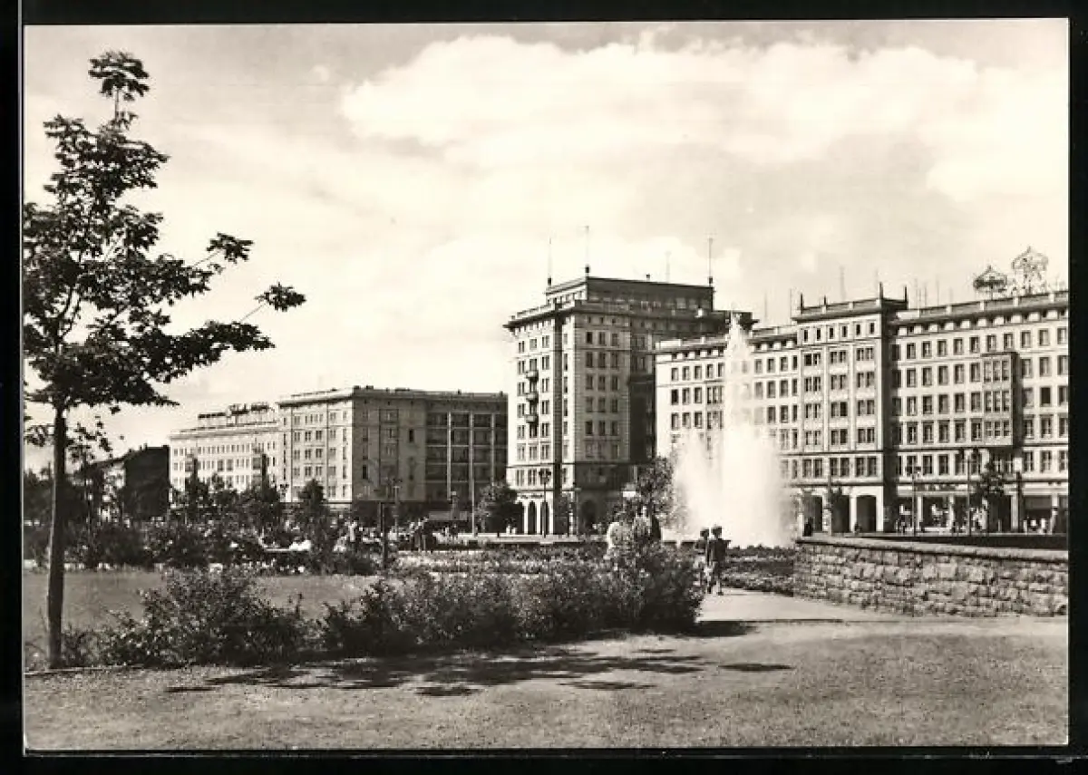 AK Magdeburg, Wilhelm-Pieck-Allee, Blick auf Gebäude mit Brunnen