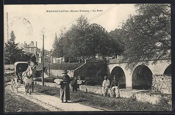 AK Magnac-Laval, Le Pont avec une calèche et des habitants au bord de la rivière