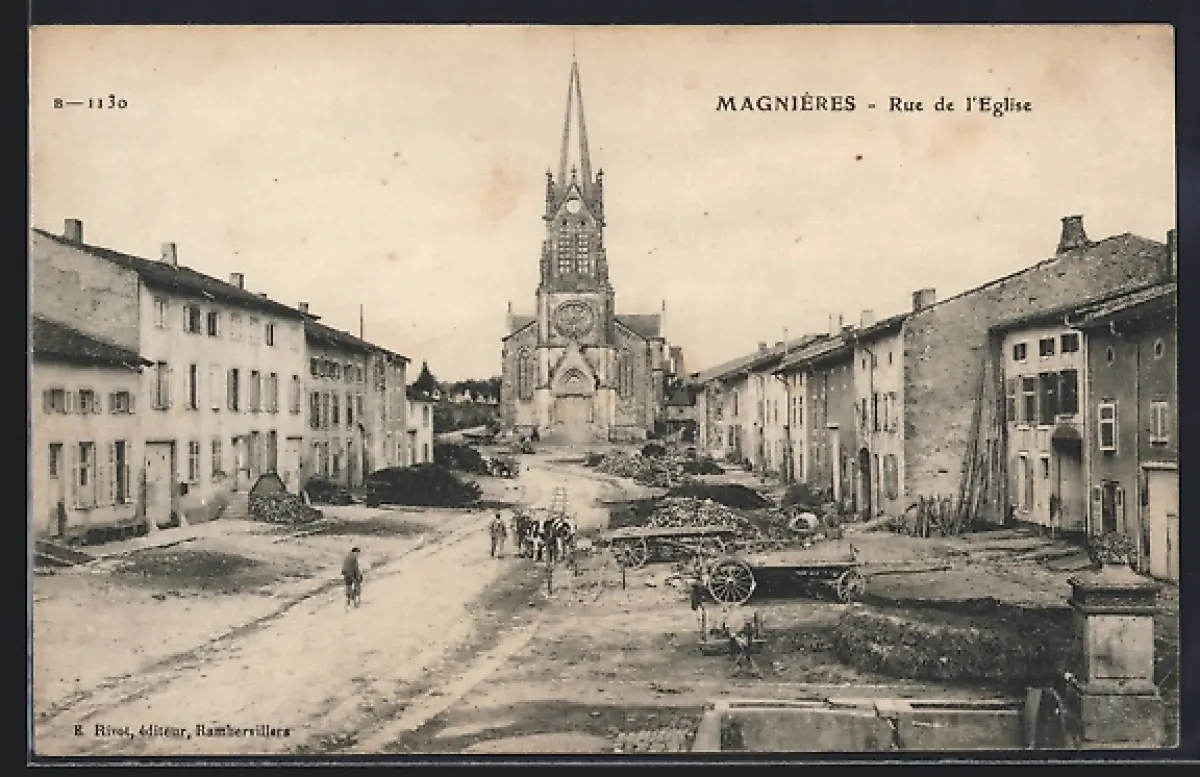 AK Magnières, Rue de l`Église avec vue sur l`église et les bâtiments environnants