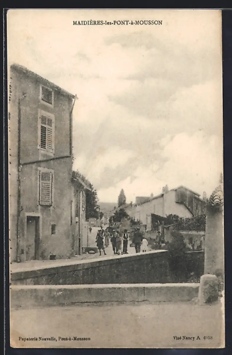 AK Maidières-le-Pont-à-Mousson, Scène de rue animée avec des passants et maisons anciennes