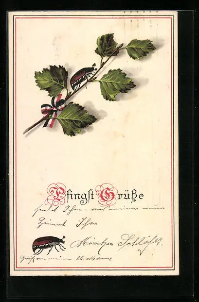 AK Maikäfer auf Birkenzweig mit Schleife in schwarz-weiss-rot, Pfingstgruss