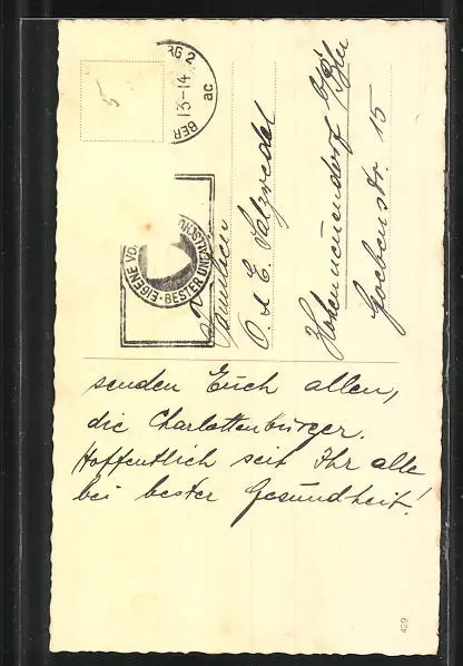 Personenbezogene Daten auf der Rückseite der Karte wurden durch blauen Textmarker unkenntlich gemacht. Die blauen Stellen sind auf die Vorderseite durchgeweicht und wirken sich negativ auf das Postkartenfoto aus