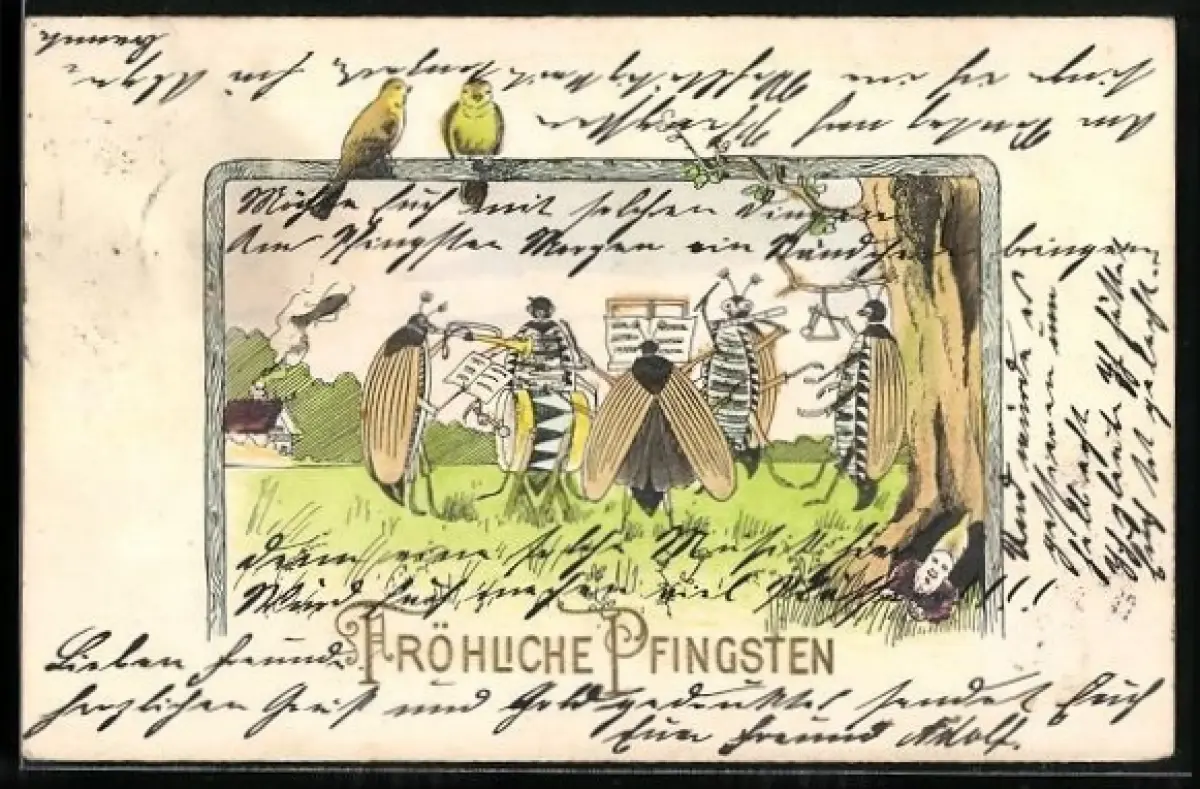 AK Maikäfer musizieren auf einer Wiese, Pfingstgruss
