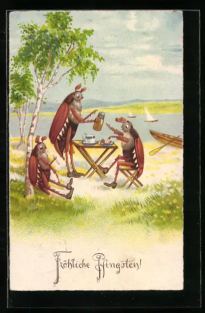 AK Maikäfer sitzen am Gartentisch und essen, Pfingstgruss