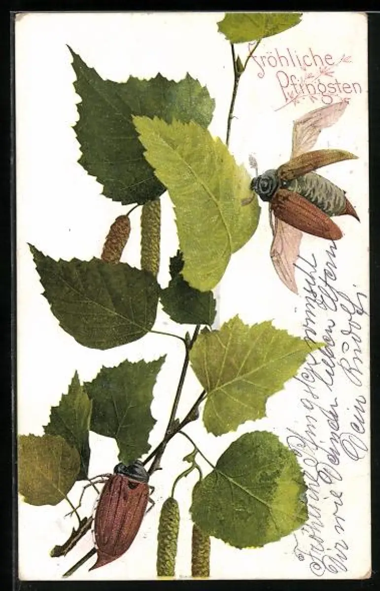 AK Maikäfer sitzen auf einem Ast, Fröhliche Pfingsten!
